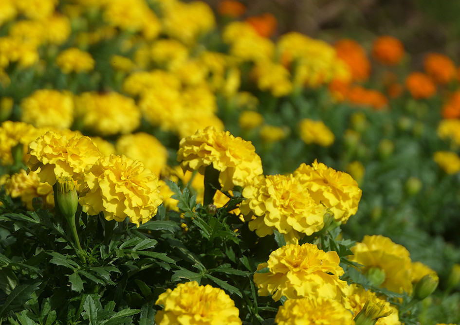 マリーゴールドは、花壇の定番品目ともいえるポピュラーな花です。マリーゴールドには独特のにおいがあり、他の植物の害虫の防除にも役立つそうです。花期が長く、霜が降りるまで咲き続けます。