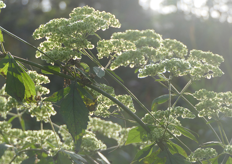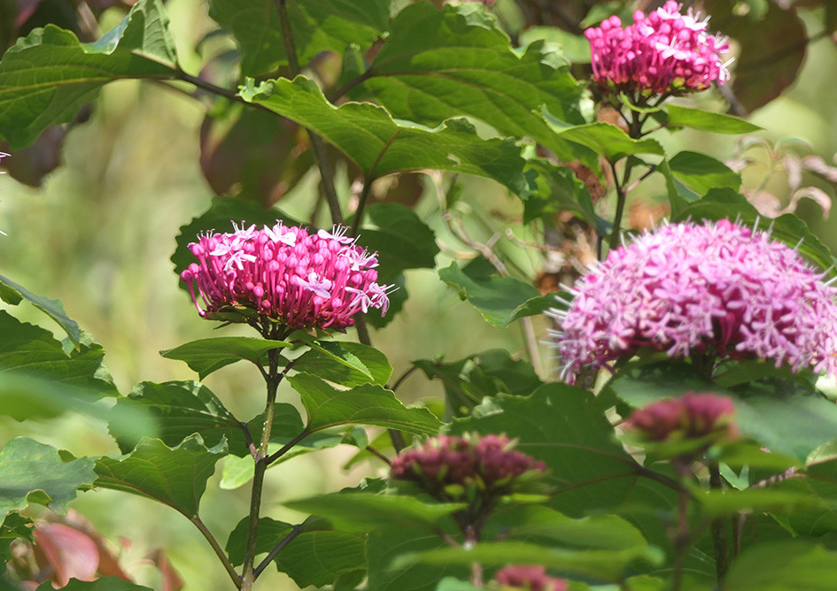 7月15日のインスタグラムでも紹介したボタンクサギが、10月下旬、再び満開です。日本名を漢字で書くと、牡丹臭木、葉を傷つけたり、枝を切ったりすると臭いのですが、花はよい香りがします。英名ではCashmere Bouquet カシミアブーケというそうです。こちらのほうが、花のイメージにぴったりですね。