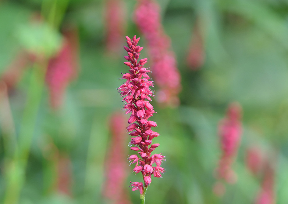 ペルシカリアは、夏から秋にかけて、スッと伸びた茎の先に鮮やかな赤い花を穂状に咲かせる多年草です。暑さ、寒さに強く、昨年秋に3株ほど植え付けたのですが、この夏の終わりから穂が伸びはじめ、初めは穂の数がとても少なかったので心配しておりました。今は、けっこうな数の穂が立ち上がって、とてもきれいです。