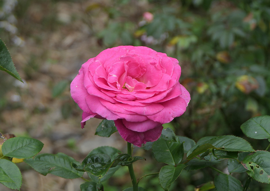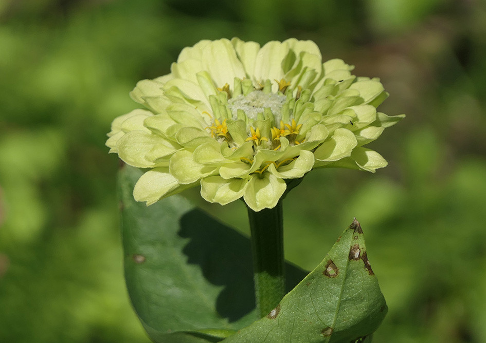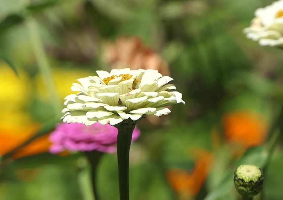 ヒャクニチソウは、ジニアとも呼ばれる一年草です。百日草と書き、その名の通り開花期間は3か月以上ととても長く、見栄えもよいので、ガーデンでは重宝して使っています。ただ、背丈が伸びると茎が倒れてしまい、そこから垂直に花が立ち上がります。少し行儀の悪い花です。7月から咲いているので、ぼちぼち花も終盤、葉っぱもだいぶ傷んできました。