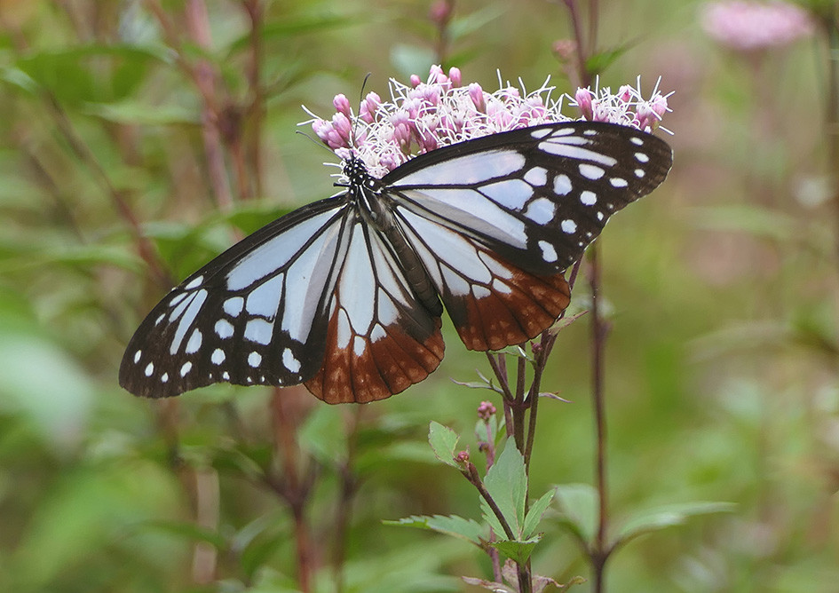 さて、10月、ガーデンに待望のアサギマダラがやって来ました。薄桃色のフジバカマが咲き始めた途端のご来園です。