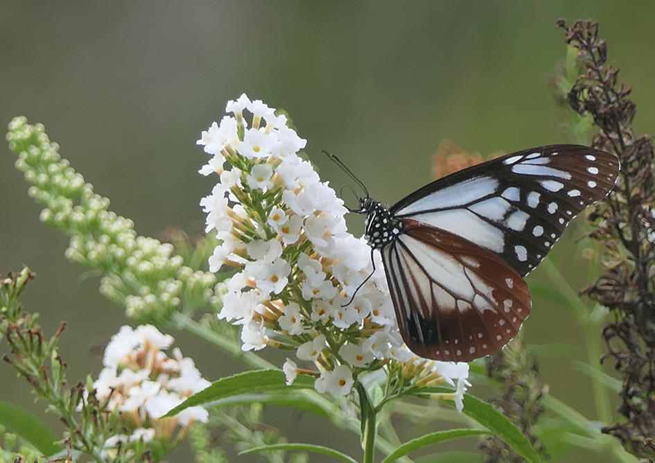 ガーデンには、いろんな花が咲いていますが、アサギマダラが花の蜜を吸うのは、決まってフジバカマです。他の花のところにはあまりいきません。不思議ですね。ただし唯一、ブッドレアの花のところには、止まっていました。