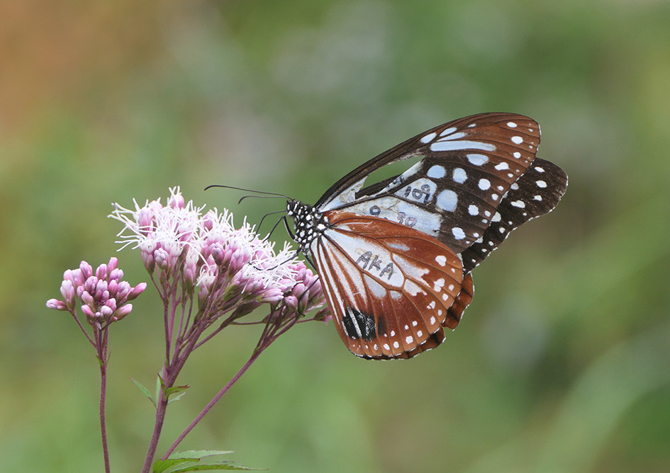 19日に来園したアサギマダラには、羽にマーキングがされていました。飛行ルートの調査だと思いますが、かわいそうに両方の羽はひどく痛んでいます。マーキングで捕獲された際、傷つけられてしまったのだと思いますが、この個体は、21日にも見かけたので、少なくとも3日間、ガーデンに滞在していたことになります。おそらく、あまり遠くには飛べないと思います。