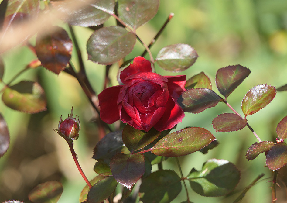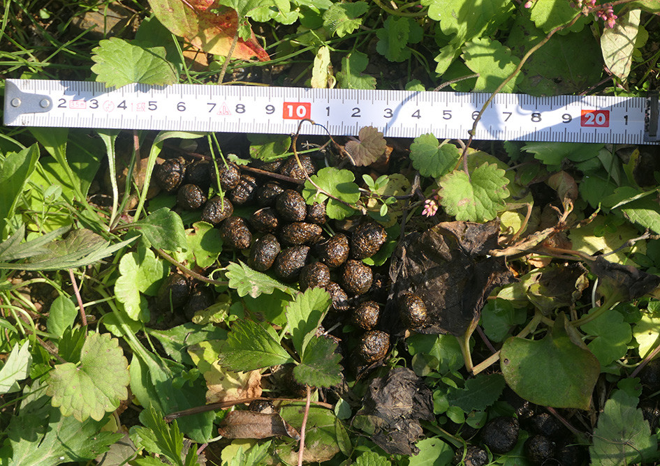 12月2日(火)、朝、ガーデンに来て、いつものようにあっちこっちを見て回っていました。バラのところに来て、あれっと気が付きました。高さが40cm以上あったはずであるバラ バーガンディアイスバーグの枝が、なくなっていました。よく見ると、根元の方の茎が、スパッと切ったような切り口で残っていました。また、ノウサギがやったな、とすぐにわかりましたが、ノウサギの痕跡がどこかにあるはずです。奥の草むらを探していると、ありました。ノウサギのフンです。