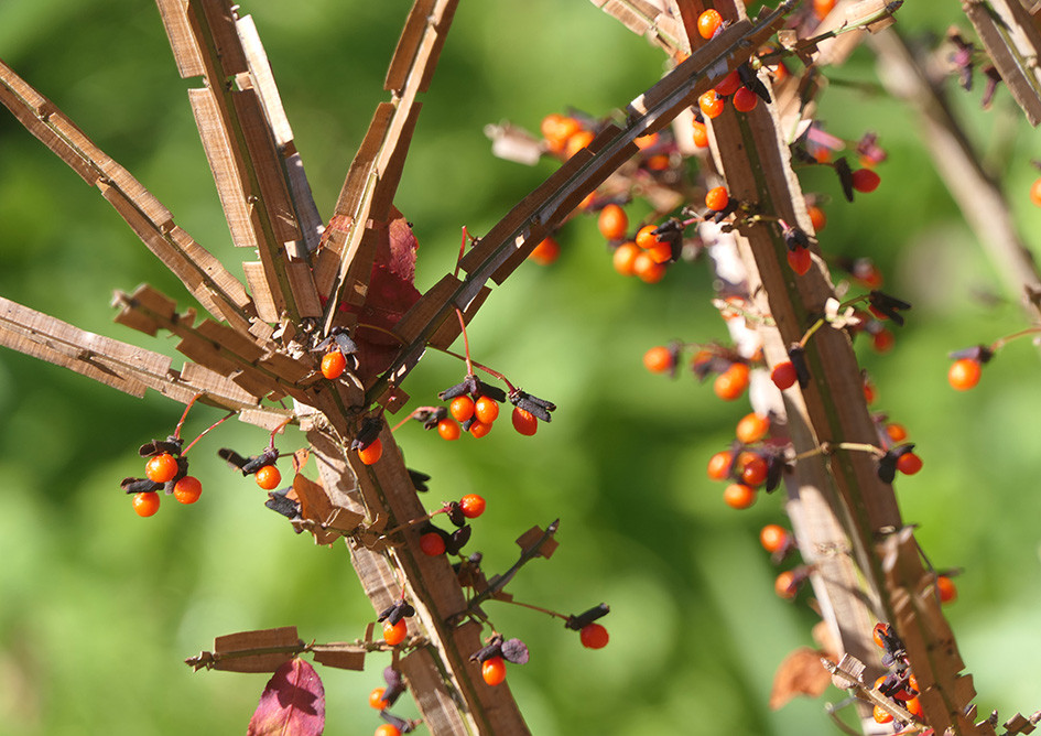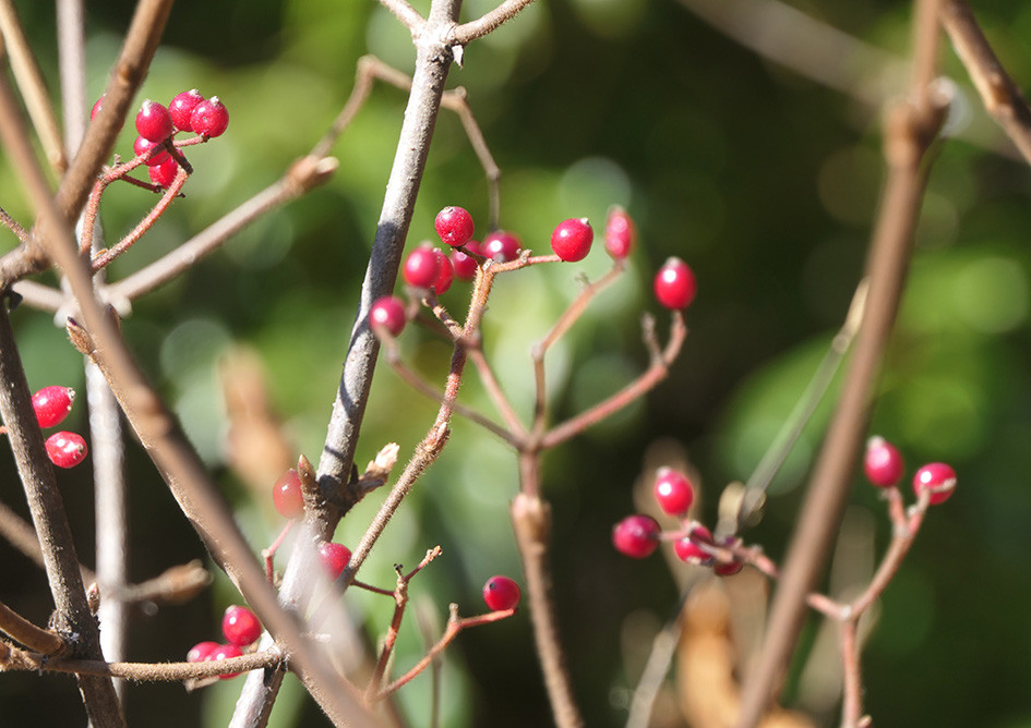 木の実は、葉っぱが落ちてかなり目立ってきました。ガマズミ、ニシキギ、グミ、サンシュユ、ナンテンなどの実が、目につくようになりました。いずれ、鳥に全部食べられてしまいます。
