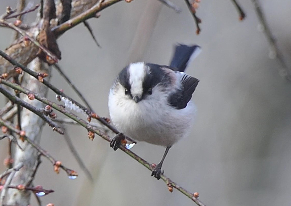 エナガは、群れで時折ガーデンにやってくるのですが、あいかわらず、すばしこく動き回り、忙しい、忙しい、と言っているようです。北海道ではシマエナガが大人気ですが、本州のエナガも捨てたものではありません。ぜひ、ガーデンで商品化したいですね。