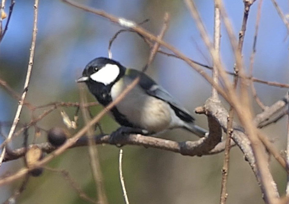 写真の小鳥はシジュウカラです。まだガーデンには、ナンキンハゼやグミなどの木の実が残っていますので、彼らはそれを好んで食べに来ます。