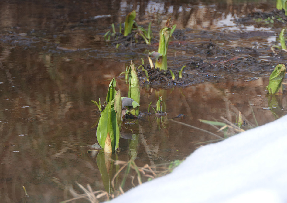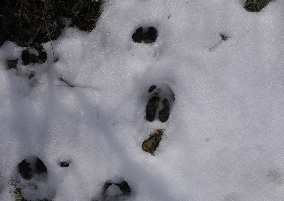 ただちに、フェンス周囲をくまなくチェックしていきました。そして、侵入路が判明しました。ミズバショウの北側奥の隣家との境界に設置していた防獣ネットが雪の重みで倒れていました。シカはそれを見つけて、まんまとガーデンに侵入し、ミズバショウのそばを抜けて、ニッコウキスゲと菜の花のところにやってきたのです。ミズバショウの奥には、シカの足跡がしっかり残っていました。幸い、ミズバショウが食われることはありませんでした。