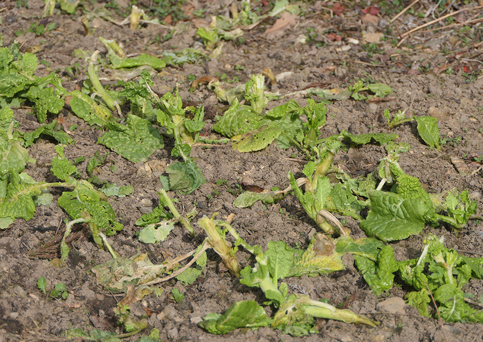 被害に気が付いたのは22日(日)、ニッコウキスゲの冬芽が食われていることに初めて気が付きました。あたりを見渡すと、菜の花の株の上部が、すべて食いつくされていました。やられた、と思いました。